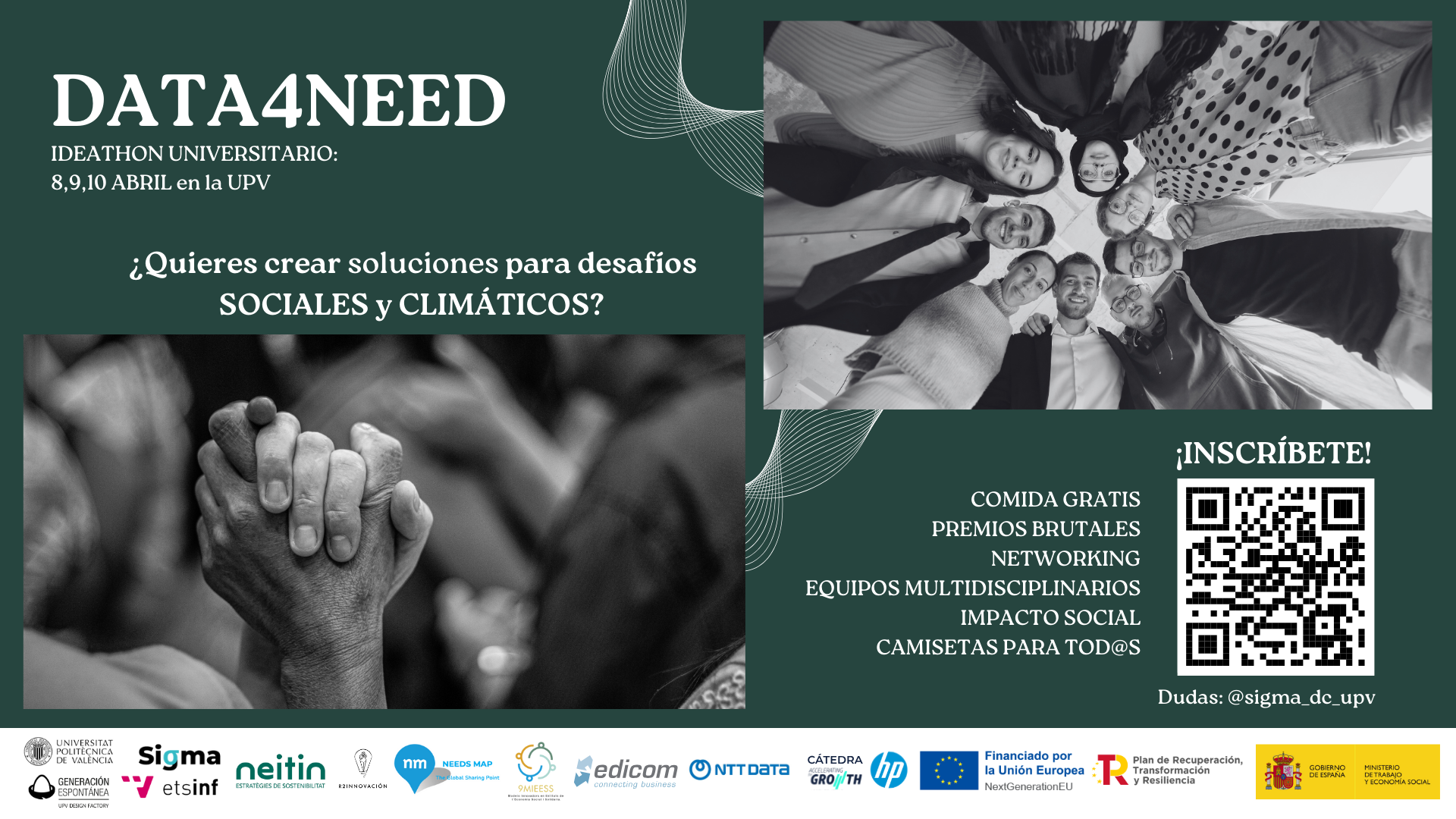El Ideathon Data4Need, celebrado los días 8, 9 y 10 de abril en la Universitat Politècnica de València, reunió a estudiantes de diferentes disciplinas con el objetivo de diseñar soluciones tecnológicas con impacto social y climático real. El evento fue organizado en colaboración con las cooperativas Neitin y NeedsMap, como parte del segundo objetivo del PERTE 9MIEES para la transformación a través de la economía social.