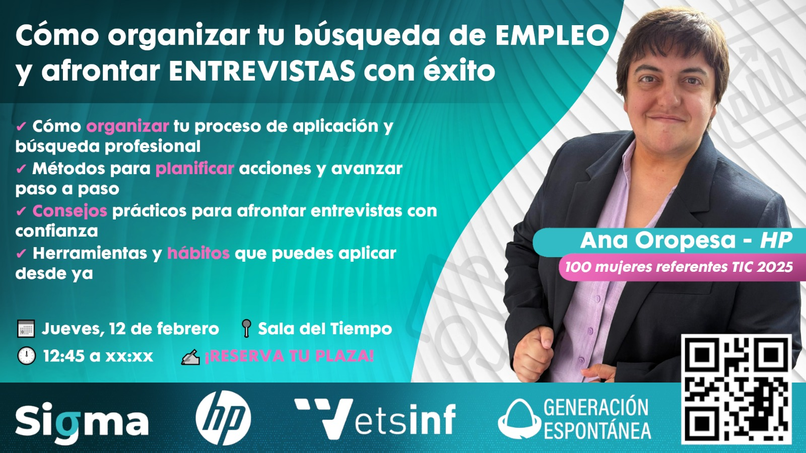 El jueves 12 de febrero, el grupo de Generación Espontánea UPV Sigma Data Club organizó una charla profesional con Ana Oropesa, Ingeniera en IA y Datos en HP, con el objetivo de orientar a los estudiantes en la búsqueda estratégica de empleo dentro del sector tecnológico.